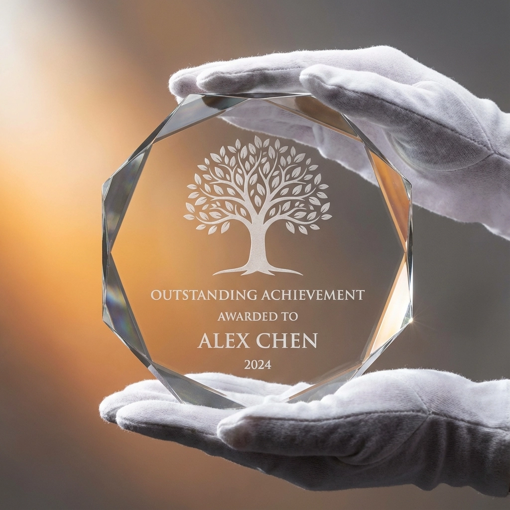 Crystal awards communicate prestige and permanence. Perfect for major achievements like "Executive of the Year" or milestone celebrations.